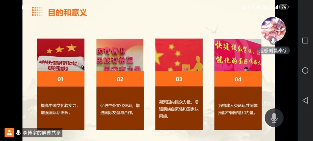 我院22级遥感一班在1月14日20:05于线上开展“讲好中国故事,凝聚时代力量”团日活动。此次活动由团支书张月琪组织,班长李博宇、组织委员刘昌泰宇、宣传委员刘娜合作完成。