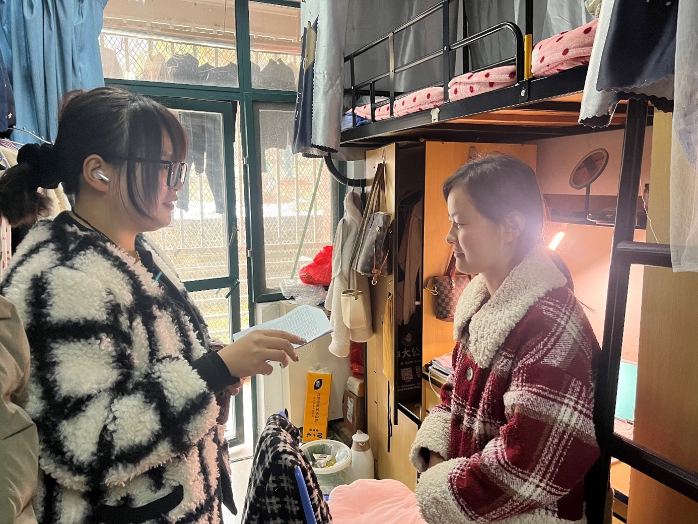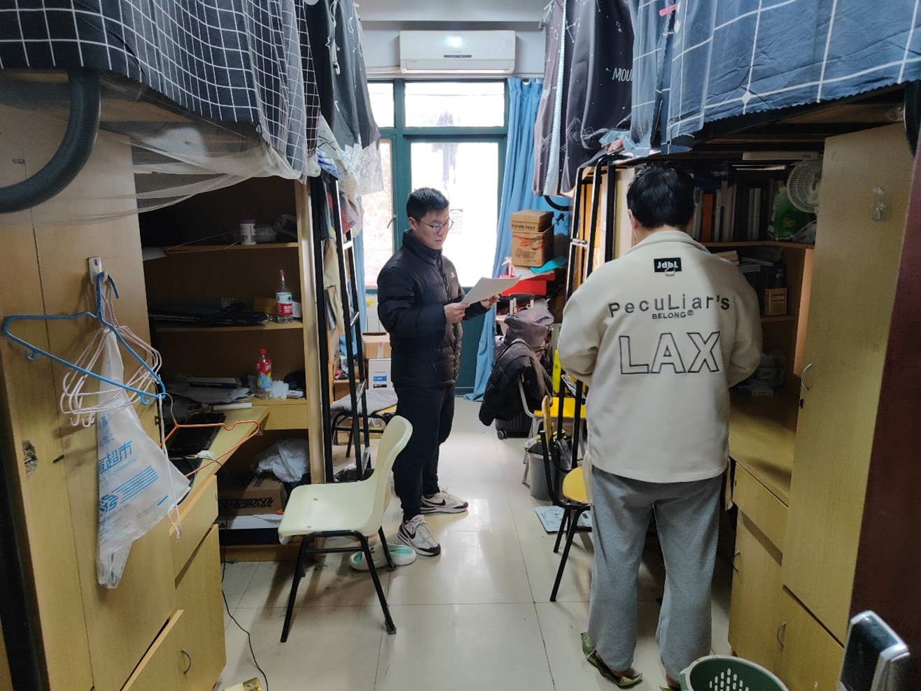 走访过程中,详细了解每位同学的学习生活情况,提醒同学们要互帮互助互爱,在学习上比学赶帮超,好学力行,学有所成,不负韶华;要常态化做好宿舍清洁卫生,坚持每天通风保持室内空气清新;要强化安全意识,提升安全防范能力,严禁使用存放违章电器,严禁私拉电线网线,严禁在宿舍内给电动车电池充电,养成离开宿舍切断电源的习惯,严禁在宿舍抽烟,阳台杂物要及时清理,全力确保宿舍安全。杨政军老师还友情提醒同学们,如果在学习生活中遇到困难和问题,欢迎向辅导员老师及时反映,只要是关乎学生合理合法权益、安全健康等方面的问题,学院都会尽量帮助解决,竭尽全力做好相关服务工作,解除同学们的后顾之忧,助力大家成长成才。
