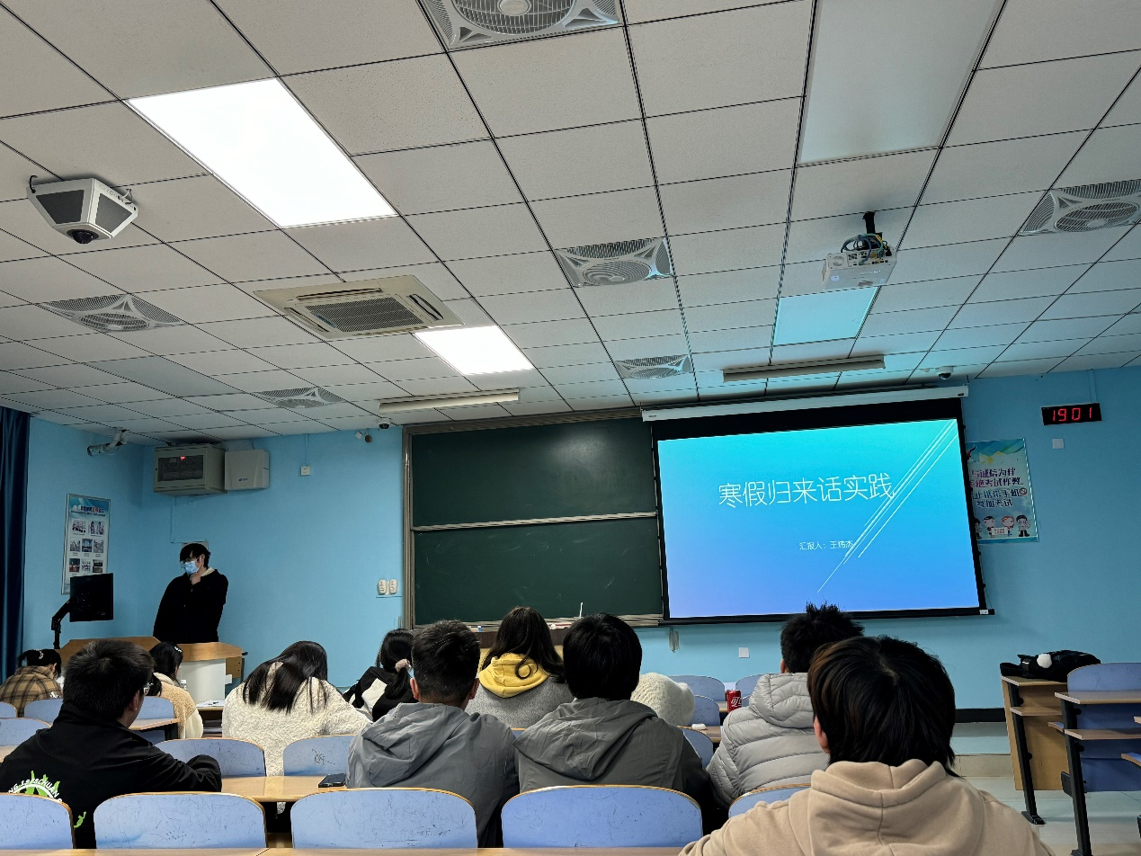活动伊始,陈若兰同学向我们介绍了此次团日活动的主题和内容。随后王炜杰同学分享了他假期在宾馆工作实习的经历。因为这个冬天哈尔滨的“爆火”,让周边的城市旅游也随之复苏。在社会实践的过程中,王炜杰同学深刻感受到了这一点带来的影响,尽管天寒地冻,当地人们仍尽自己最大努力为客人提供好的服务。醉后陈永乾同学则分享了自己和老乡在街边卖年货的经历,这些实践活动都极大的丰富了同学们的假期生活。