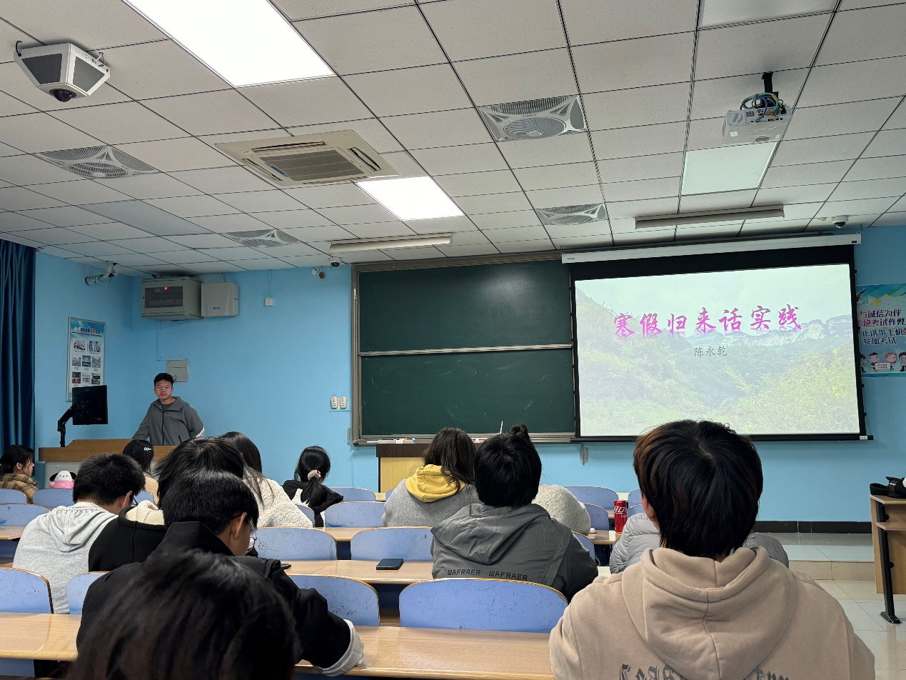 为了引导广大青年学生在实践中受教育、长才干、做贡献,不断增强青年学生的社会责任感,3月11日19时,我院环境工程22-1班团支部在博四A403开展了以“寒假归来话实践”为主题的团日活动。本次活动由团支书陈若兰主持,宣传委员黄姝婷进行拍摄。