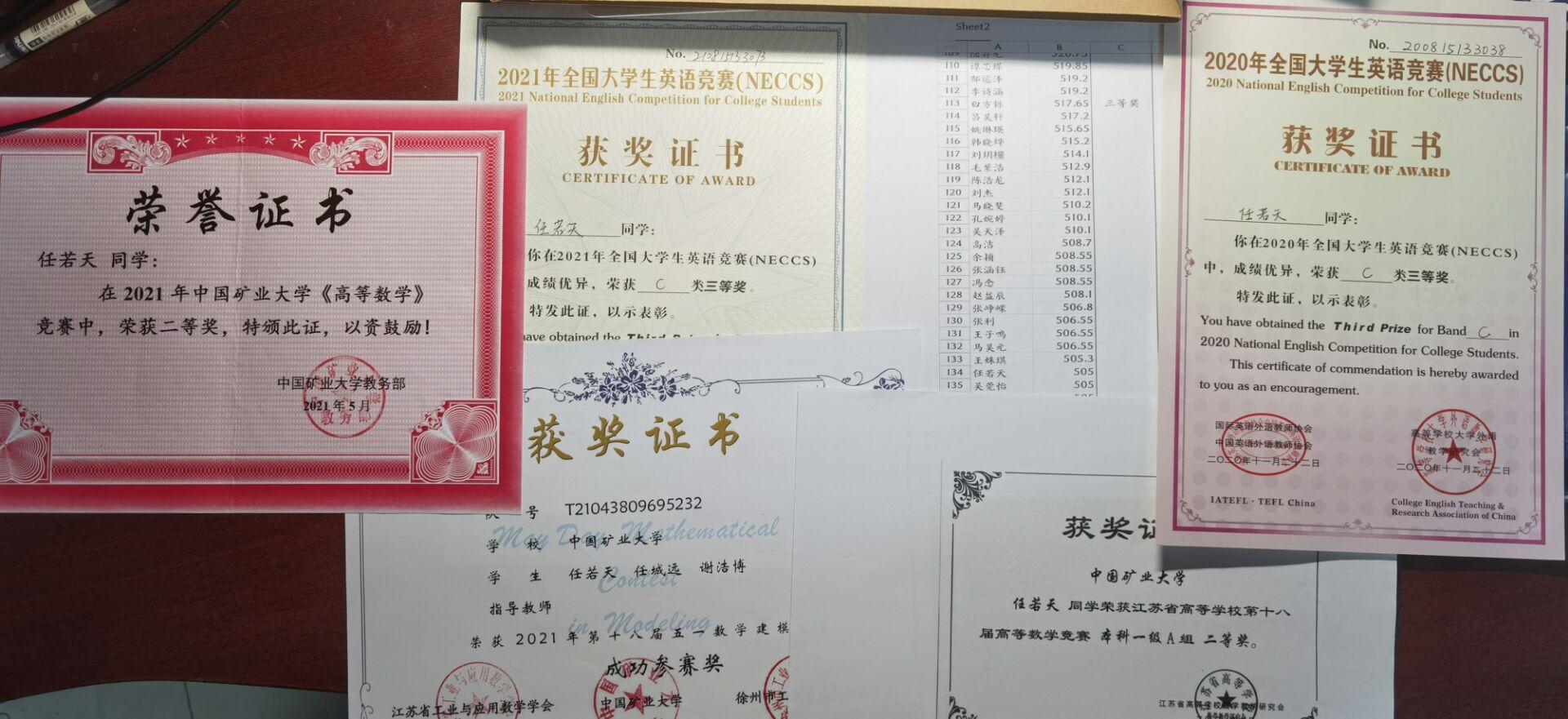 图为任若天所获证书
