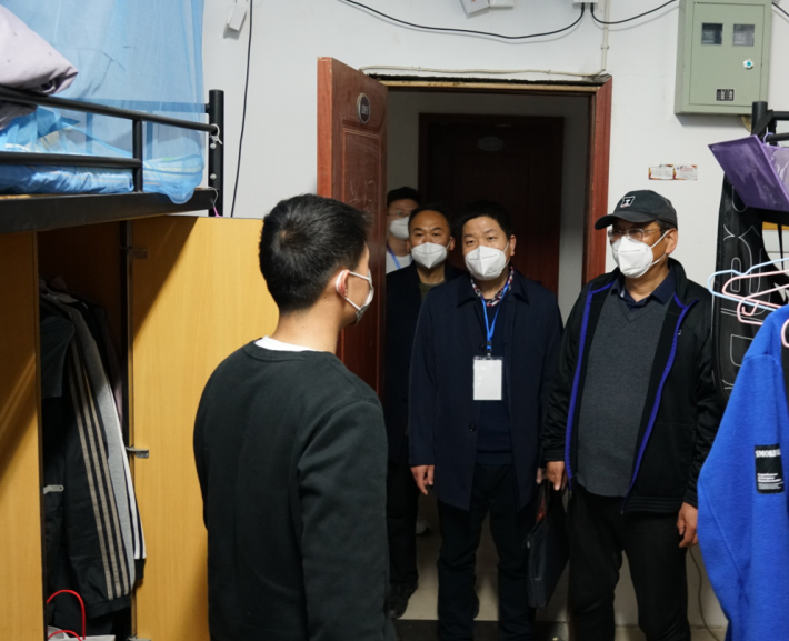 在宿舍区,学院领导老师们详细地询问了同学们疫情期间期在线学习的情况,返校的行程,毕业生的升学和就业情况,以及返校后家长们的想法。仔细检查了学生宿舍安全、卫生和消毒状况,嘱咐同学们疫情防控期间要遵守学校的相关规定,保持个人卫生,做好宿舍的通风和消毒,按时完成晨午检和晚点名。和同学们强调,疫情防控和学习要一起抓,要时刻保持良好学习的状态,认真完成学业与科研任务,不能放松。