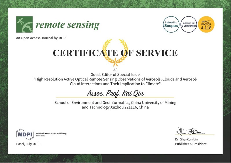 近日,我院秦凯老师应邀担任SCI学术期刊《Remote Sensing》的(JCR1区,2018年影响因子4.118)客座编辑(Guest Editor),与意大利CNR-IMAA的Simone Lolli博士、台湾国立中央大学Sheng-Hsiang (Carlo) 副教授、美国Naval Research Laboratory的James Campbell博士共同负责以“High Resolution Active Optical Remote Sensing Observations of Aerosols, Clouds and Aerosol-Cloud Interactions and Their Implication to Climate”为主题的专刊(Special Issue)出版工作。