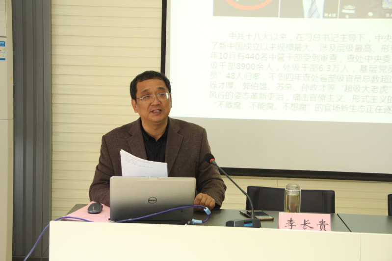 上午9点会议正式开始,李长贵书记代表学院对参加此次开班典礼的领导及学员,对韶关市国土资源局一直以来的信任和支持表示了衷心的感谢,并简要介绍了学院的基本情况及学院与韶关国土资源局合作的历史及现状。他表示学院高度重视此次培训班,为办好此次培训班,学院将为各位学员制定完善的课程安排、采取灵活多样的培训方式、提供强大的授课师资,并专门配备两名班主任全程做好服务工作。随后,李书记围绕《做好反腐倡廉,加强廉洁从业教育》主题开始讲课。本次课程从充分认识新时代反腐败斗争的新形势、严格执行中央“八项规定”、增强党员干部廉洁从业拒腐防变的能力三方面展开。