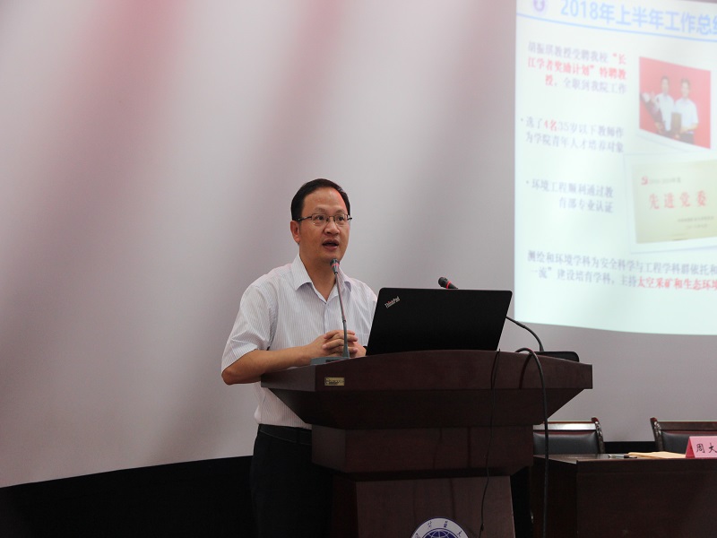 张绍良院长对2018上半年的工作进行总结。他指出,在落实学院各项重点工作过程中,我院全体教职工齐心协力,有效地促进了各项工作的按期推进,取得了优异的成绩。在2018年,学院取得了重大成就,其中包括获得国家科技进步奖2项、地理信息科技进步奖一等奖1项、二等奖2项、环境工程顺利通过教育部专业认证、环境生态学ESI贴近度达到72%以及院党委被评为2016-2018年度先进党委等。随后,张绍良院长对下学期的学科建设、人才培养、科学研究等工作进行了部署,提出做好新一轮岗位聘任工作,完善考核制度、推进“中非国际合作研究中心”建设工作、启动测绘工程第二轮认证工作等具体措施。他还重点指出,学院要积极推进“双一流”学科和向ESI一流学科建设工作的奋斗方向。