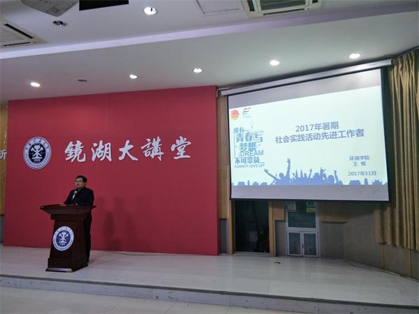 我院荣获2017年暑期社会实践先进单位(全校仅评6个,我院排名第2);王铭老师获江苏省社会实践先进工作者荣誉称号,并作为先进个人代表做工作交流;“农村在校教师调研团”获市级优秀团队奖项;院团委学生副书记王琳获市级先进个人荣誉称号;“大学生世纪环保组织暑期实践团”等3支团队荣获优秀团队;高旭等48人获校级先进个人荣誉称号;“奎河(徐州段)水质现状调研报告”获优秀社会实践调研报告。