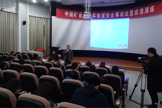 11月16日下午3:00,中国矿业大学实验室安全事故处置应急演练在我院实验室举行。赵建岭副校长出席,并同到我校交流工作的四川大学实验室及设备管理处夏建刚、金永东副处长一行11人和全校近200名师生在环B109全程观摩了演练活动。演练活动由保卫处处长钱红军主持。