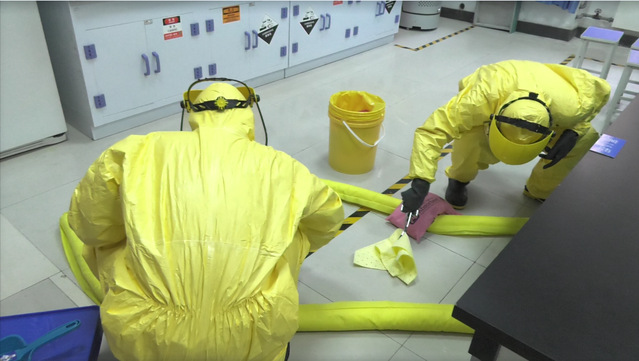 按照事故危害的层级由低到高,参演人员先后模拟了浓硫酸倾倒泼洒实验台面、实验室有机废液泄漏、实验引发火灾3个事故案例的应急处置。在最后一个案例中,保卫处、校医院、徐州市公安消防支队先后演练了应急救援和险情处置、心肺复苏急救、科学消防灭火等内容。为确保演练效果,现场不允许围观,所有师生在环B109观看了视频直播。演练结束后,赵建岭副校长进行了点评并同演练人员和工作人员合影留念。
