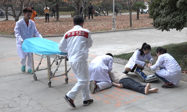 校医院医生和体育学院学生进行心肺复苏等紧急救护