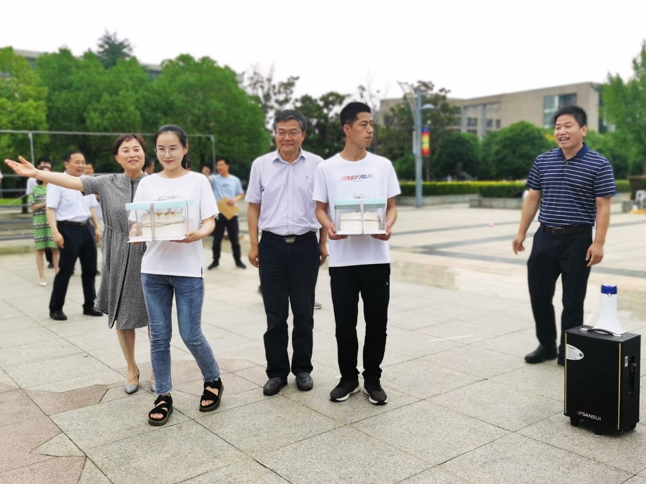 经毕业班辅导员韩福顺和陆雨了解,拍摄毕业合照当天是左劼和薛磊的生日,学院特地为他们准备了生日蛋糕为他们庆祝。刘波书记和卞正富副校长为他们送上生日蛋糕,同学们也纷纷唱起生日歌送去生日祝福。