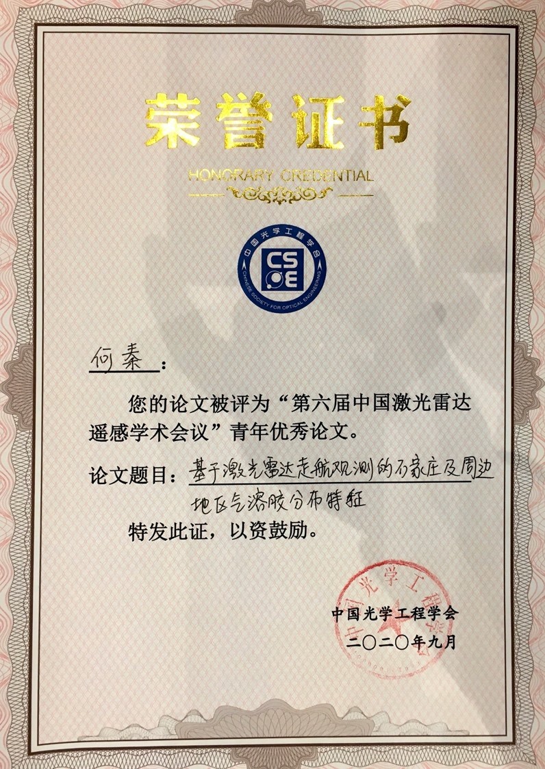 我院秦凯教授指导的硕士生何秦参加会议,并在激光雷达信息处理技术和应用专题作了题为“基于激光雷达走航观测的石家庄及周边地区气溶胶分布特征”的报告,所对应的论文同时被评为青年优秀论文。与会期间,研究生听取会议报告,并积极与相关领域的专家学者交流讨论,促进了对激光雷达遥感研究现状与未来发展方向的认识。