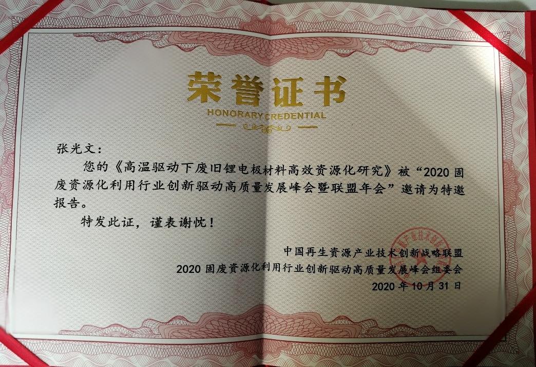 本次大会以“凝聚创新共识、绿色技术引领、共谋发展合作”为主题,以《“十四五”国家技术创新工程规划》编制为契机,谋划“十四五”固废资源化利用行业发展顶层设计,以创新驱动我国固废资源化利用行业高质量发展新动能。会议设置“金属循环利用与电子废弃物协同处置论坛、再制造产业高质量发展论坛、工业固废、废油和高分子材料资源化论坛、再生资源产业联盟青年科技论坛”等4个平行论坛,张光文讲师以“高温驱动下废旧锂电极材料高效资源化研究”为题在“再生资源产业联盟青年科技论坛”中做特邀报告。