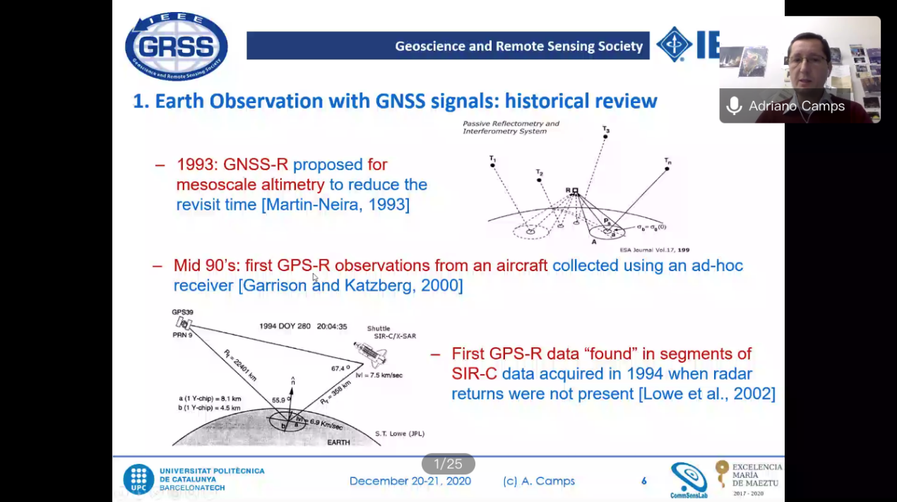 2020年12月21、22日下午,西班牙加泰罗尼亚理工大学Adriano Camps教授通过“腾讯会议”平台为我院师生做了题为“Reflectometry using GNSS-R and other Signals of Opportunity: A new paradigm for Earth Observation”的线上学术报告,报告分为“Principles”及“Applications”上下两部分。本次学术活动为学院卓越教授拓新论坛系列讲座(Distinguished Scientist Seminar Series)的一部分,受高等学校学科创新引智计划项目资助。