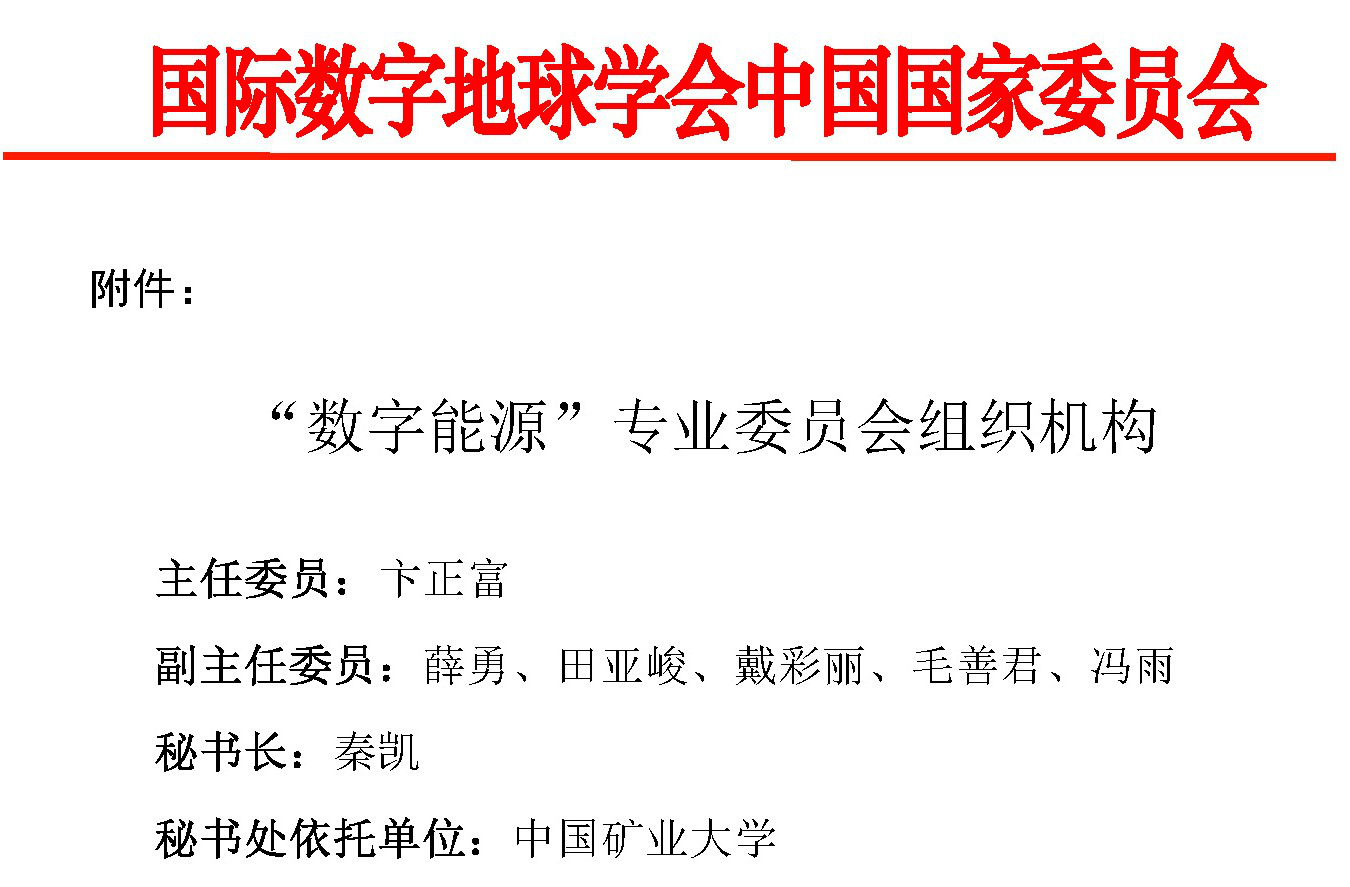 近日,国际数字地球学会中国国家委员会正式批复成立由我校发起的(秘书处依托单位)的“数字能源”专业委员会。我校副校长卞正富教授担任主任委员,国际欧亚科学院院士、我校薛勇教授,中国科学院过程工程研究所田亚峻研究员,中国石油大学(华东)教授戴彩丽教授,北京大学毛善君教授,中国煤炭运销协会副理事长冯雨担任副主任委员,我校秦凯教授担任秘书长。