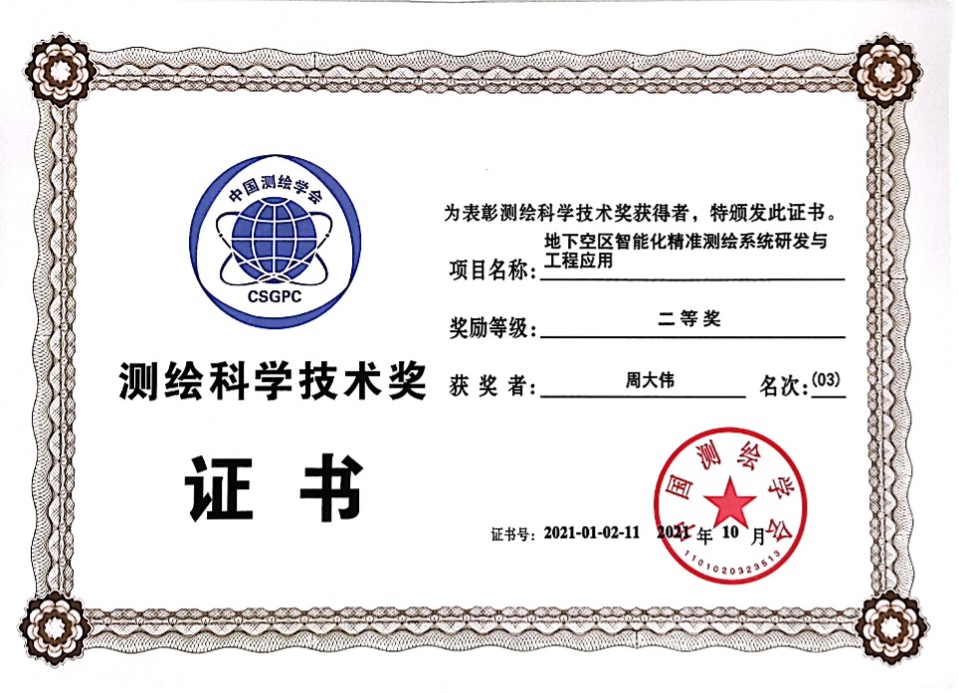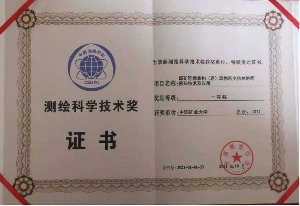 年会对2021年中国测绘科学技术奖、全国优秀测绘工程奖、青年科技创新人才奖等各类获奖人员与单位进行了表彰。我院高井祥教授牵头完成的《煤矿区地表构(建)筑物形变信息协同感知技术及应用》项目荣获测绘科学技术一等奖;我院周大伟副教授参与的《地下空区智能化精准测绘系统研发与工程应用》项目荣获测绘科学技术二等奖;高井祥教授主持的项目面向矿区构建筑物形变监测应用,攻克高精度观测信息融合定位关键技术难题,构建多源协同感知定位技术体系,研发矿区典型构建筑物监测软硬系统,具有广阔的应用前景和现实意义。