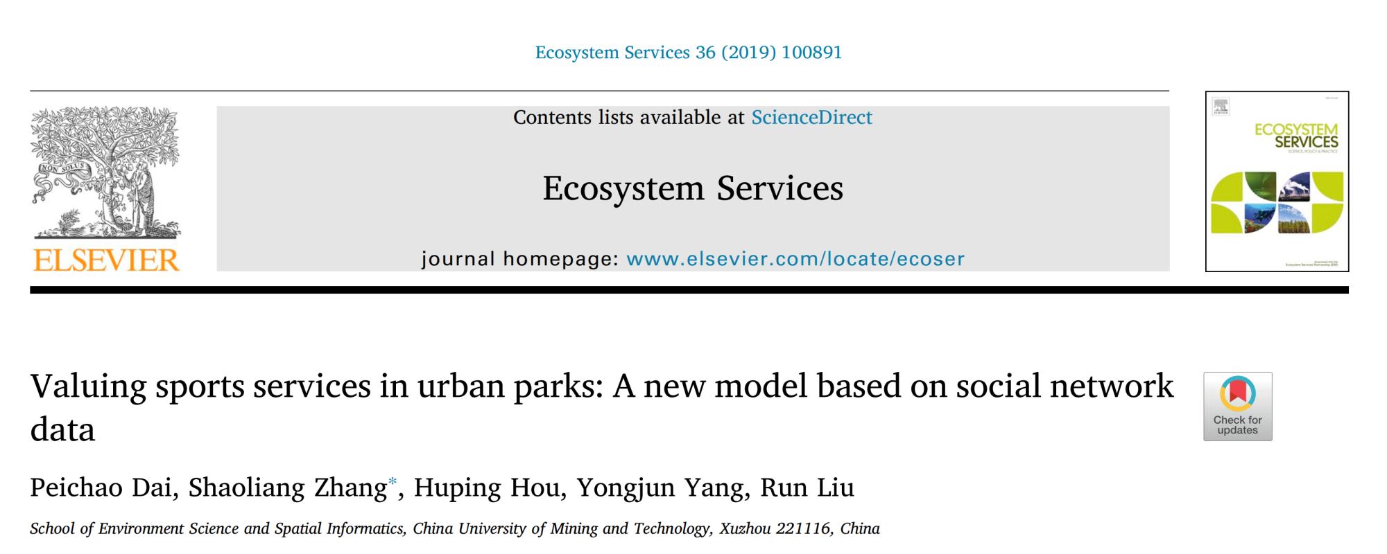 在生态系统文化服务运动价值估算方面,课题组首次采用手机运动软件数据作为其评估数据源,建立了城市公园绿地生态系统文化服务中的运动服务价值估算模型。该评估方法克服了传统通过调查问卷直接询问运动者支付意愿,以估算运动服务价值的不足和局限,为使用客观手机运动软件数据建立运动服务价值评估模型提供了新数据源及新方法,提高了评估的精度。成果以“Valuing sports services in urban parks: A new model based on social network data”为题发表在中科院Top期刊《Ecosystem Services》(IF:5.454)。