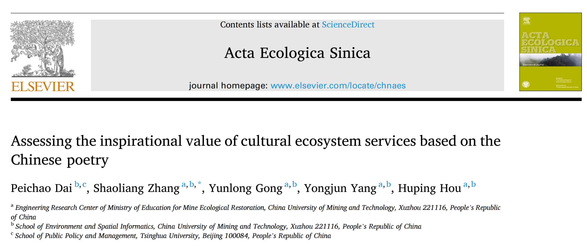 在生态系统文化服务灵感价值估算方面,课题组基于80余万首中国诗词为新数据源,建立了灵感服务生态要素分类指标体系,构建了生态要素多样性指数模型和灵感价值指数模型,并以杭州市西湖和徐州市云龙湖为案例进行实证研究。成果以“Assessing the inspirational value of cultural ecosystem services based on the Chinese poetry”为题发表在《Acta Ecologica Sinica》期刊。