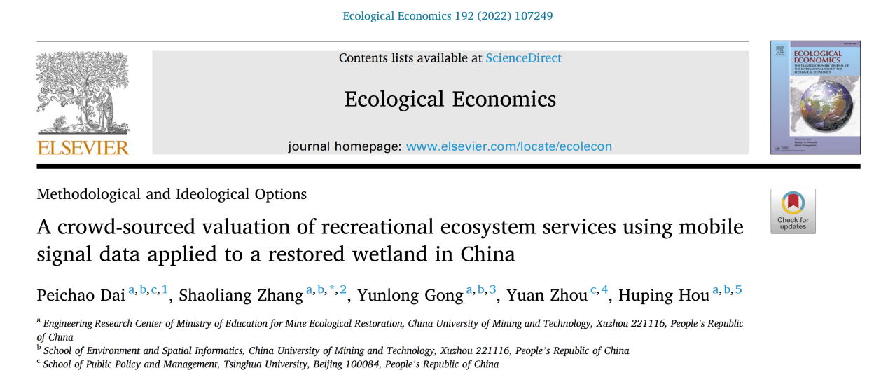 在生态系统文化服务游憩价值估算方面,课题组采集了徐州市19个城市公园近50万条游憩者手机信令数据,构建了基于手机信令数据的城市公园绿地生态系统游憩服务价值估算模型。该模型突破了传统旅行费用法估算游憩价值时参数准确度的瓶颈以及调查问卷法获取数据的效率局限,为信息网络时代游憩服务价值的估算提供了新的方法,提高了评估精度和效率,也为完善自然资源资产核算体系提供新思路。研究成果以“A crowd-sourced valuation of recreational ecosystem services using mobile signal data applied to a restored wetland in China”为题发表在中科院Top期刊《Ecological Economics》(IF:5.389,ABS3星)。