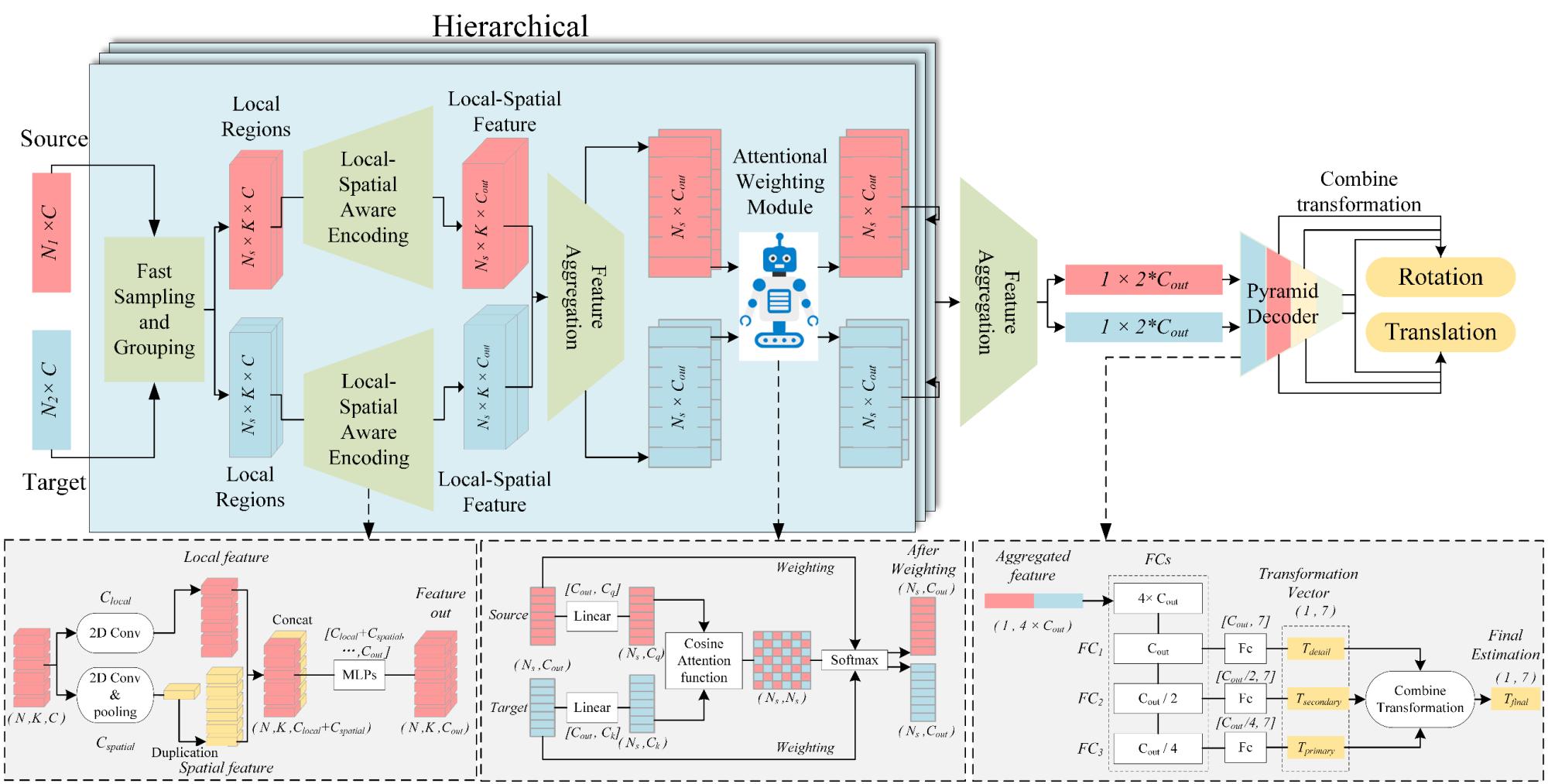 《DDRNet: Fast point cloud registration network for large-scale scenes》(Doi:https://doi.org/10.1016/J.ISPRSJPRS.2021.03.003)面向海量点云数据配准问题,提出了一个实时化的点云配准网络。该网络不仅能够为数据量较大的场景点云提供实时准确的良好配准结果,且能在低场景重叠度、点云噪声及点云稀疏性等因素的影响下保持鲁棒。研究结果对自动驾驶、机器人自主导航等领域具有一定的应用价值与意义。该论文以中国矿业大学为第一单位,张正华博士生为第一作者,陈国良教授为通讯作者、束明聪博士生、王轩硕士生为共同作者。