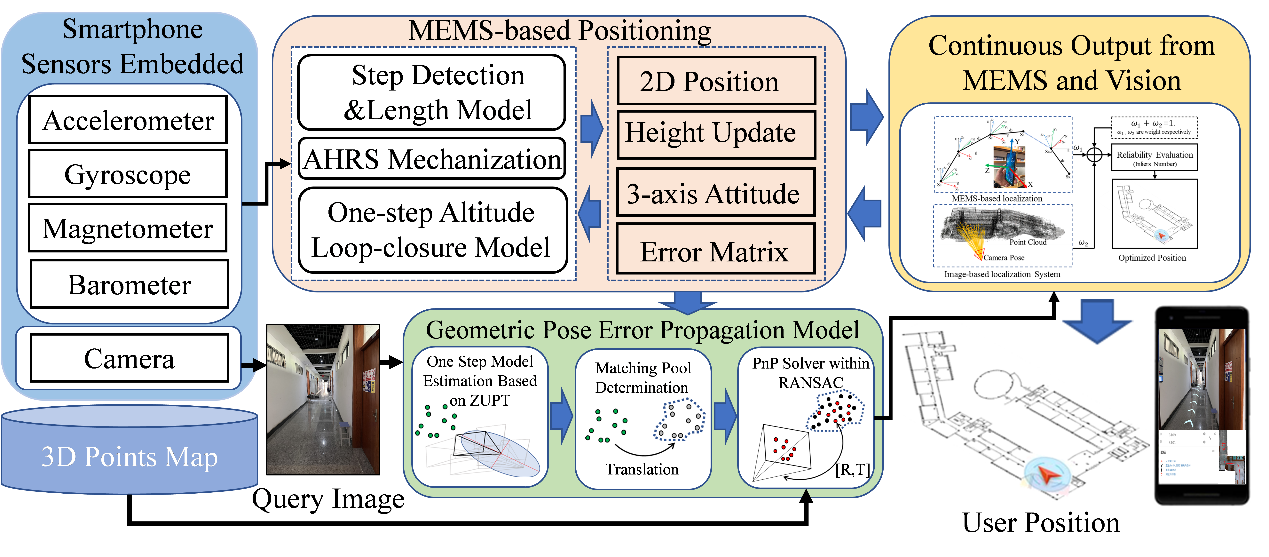 《Efficient image-based indoor localization with MEMS aid on the mobile device》(Doi:https://doi.org/10.1016/ J.ISPRSJPRS.2022.01.010)针对室内大场景下的移动端视觉定位多模态信息耦合问题,提出一种基于内置惯性单元辅助的视觉信息匹配模型,用于实现2D视觉特征与先验3D点云特征的精准匹配,提高异源视觉特征匹配率,可为移动端的AR/VR导航定位技术提供新思路。该论文以中国矿业大学为第一单位,束明聪博士生为第一作者、陈国良教授为通讯作者、张正华博士生为共同作者。