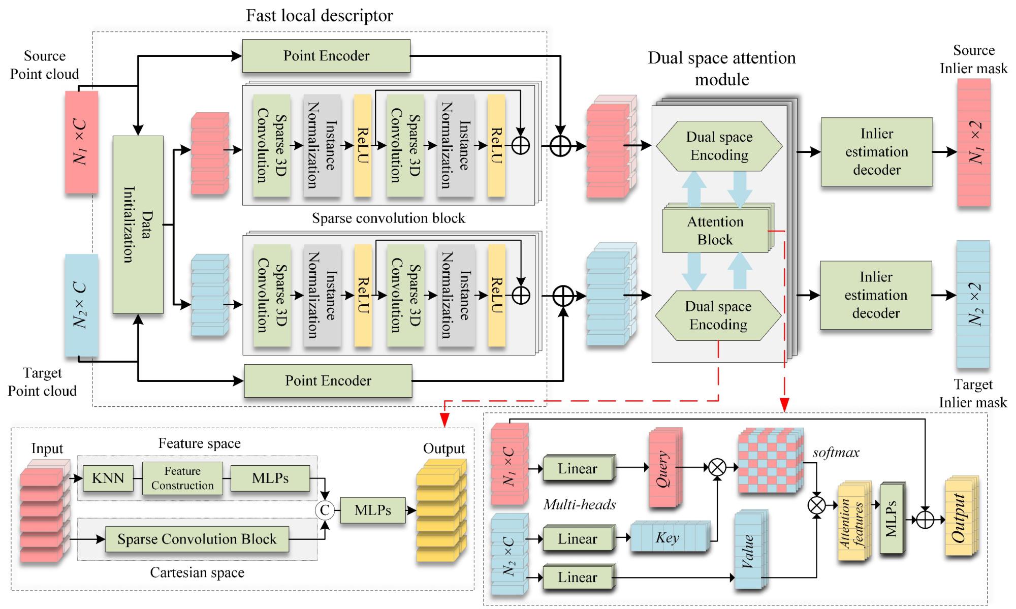 《Fore-Net: Efficient inlier estimation network for large-scale indoor scenario》(Doi:https://doi.org/10.1016/ J.ISPRSJPRS.2022.01.001)面向复杂室内空间环境对点云数据质量的影响,提出了一个实时化的点云滤波网络。该网络不仅可以有效优化原始点云的数据质量,且能够在点云噪声与点云稀疏性等因素的影响下保持算法的稳健,作为配准等后续任务的前置滤波模块可显著增强算法的性能,具有一定的场景泛化能力。论文以中国矿业大学为第一单位,张正华博士生为第一作者、陈国良教授为通讯作者、束明聪博士生、王轩硕士生为共同作者。
