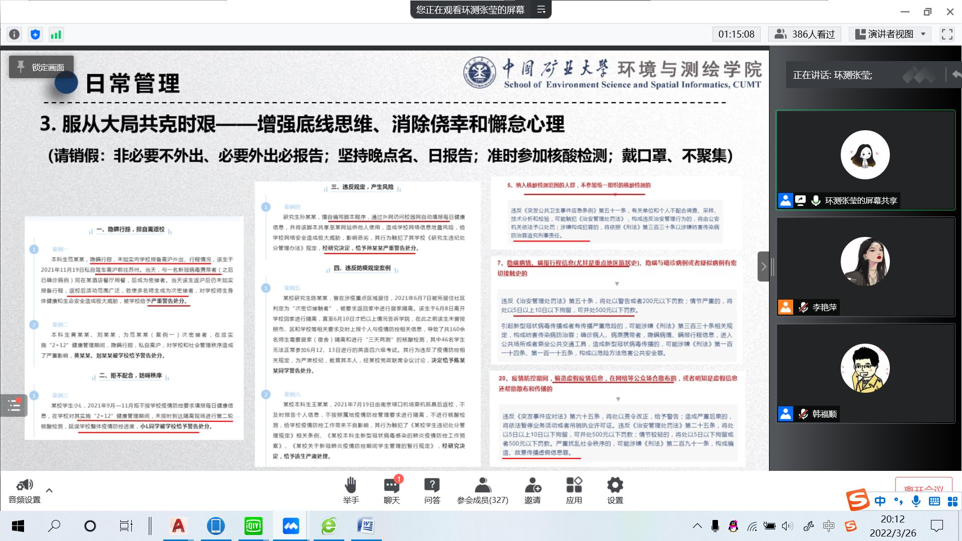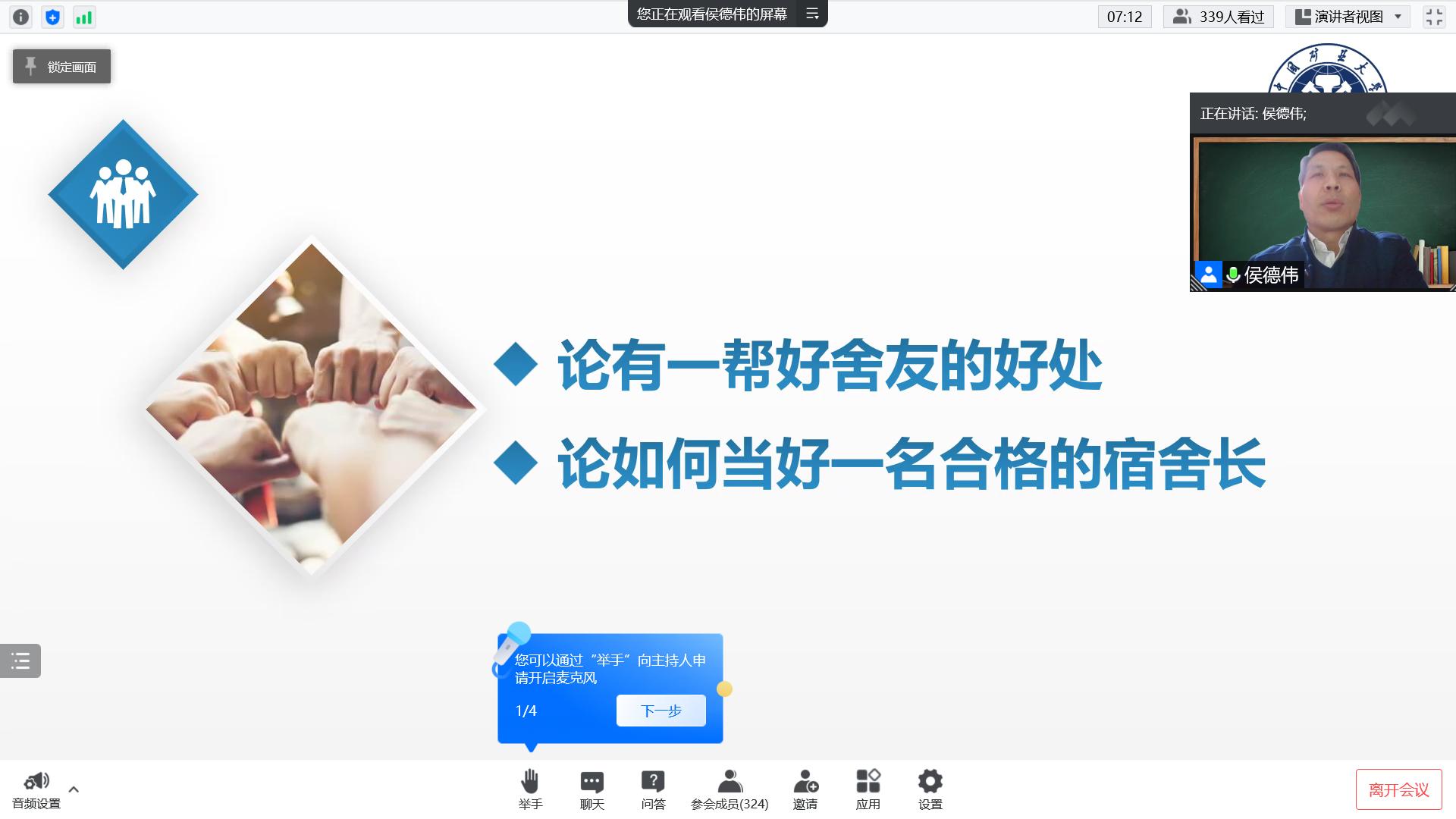 为推进安全和谐校园的构建,促进宿舍良好人际关系的形成,3月26日晚7点,我院开展了全体本科生宿舍长线上培训会,我校大学生心理健康教育中心侯德伟老师、院党委副书记韩福顺、20级辅导员张莹、21级优才专项辅导员李艳萍、我院全体本科生宿舍长及班委均参与会议。会议由张莹老师主持。