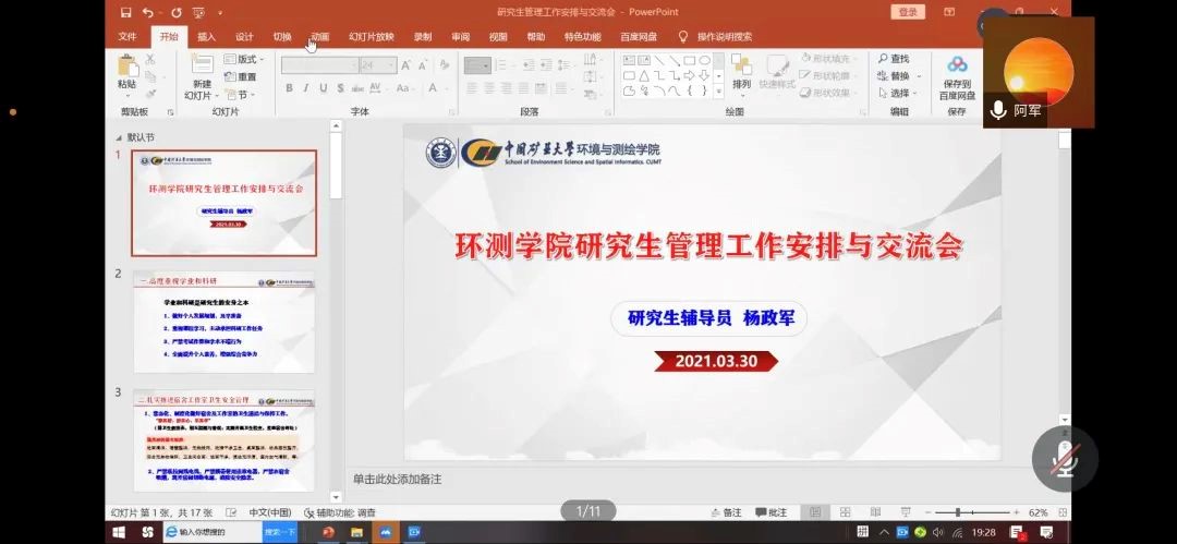 根据当前国内外疫情形势,杨政军老师要求全体研究生骨干全力配合做好疫情防控工作,认真及时做好每日信息摸排和上报工作,督促同学们按时完成日报告和晚点名,落实疫情防控举措。杨政军老师为同学们阐述了疫情防控下学校最新的请假制度和返校规定,要求研究生全体骨干构建好研究生日常管理等精细化体系,精准发现问题,建立完善的学生工作网格。