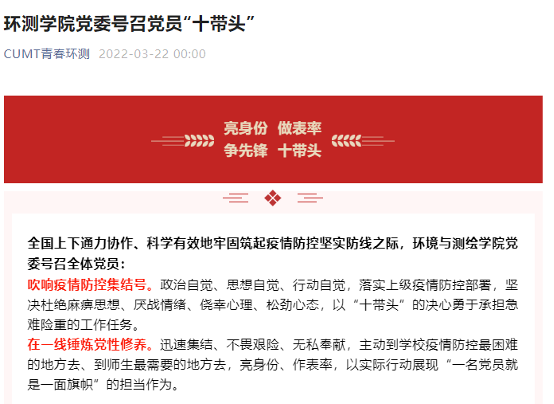 真情关注,筑牢防线。院领导参与、班主任主持召开“勇毅笃行抗疫情·共克时艰担使命”主题班会暨主题团日活动,引导同学们在活动中树立“青春同心·抗疫有我”的信心和决心。学院线上召开全院本科生宿舍长培训会、全体研究生学生干部大会等,关注学生在疫情期间的心理健康状况,积极推送学校心理咨询热线,远程关怀、连线疏导,及时消除学生的焦虑、恐惧、抑郁等情绪,引导学生积极面对疫情。开展“春日风情·环测同行”系列活动,引导同学们感受春日风光、舒缓情绪压力。