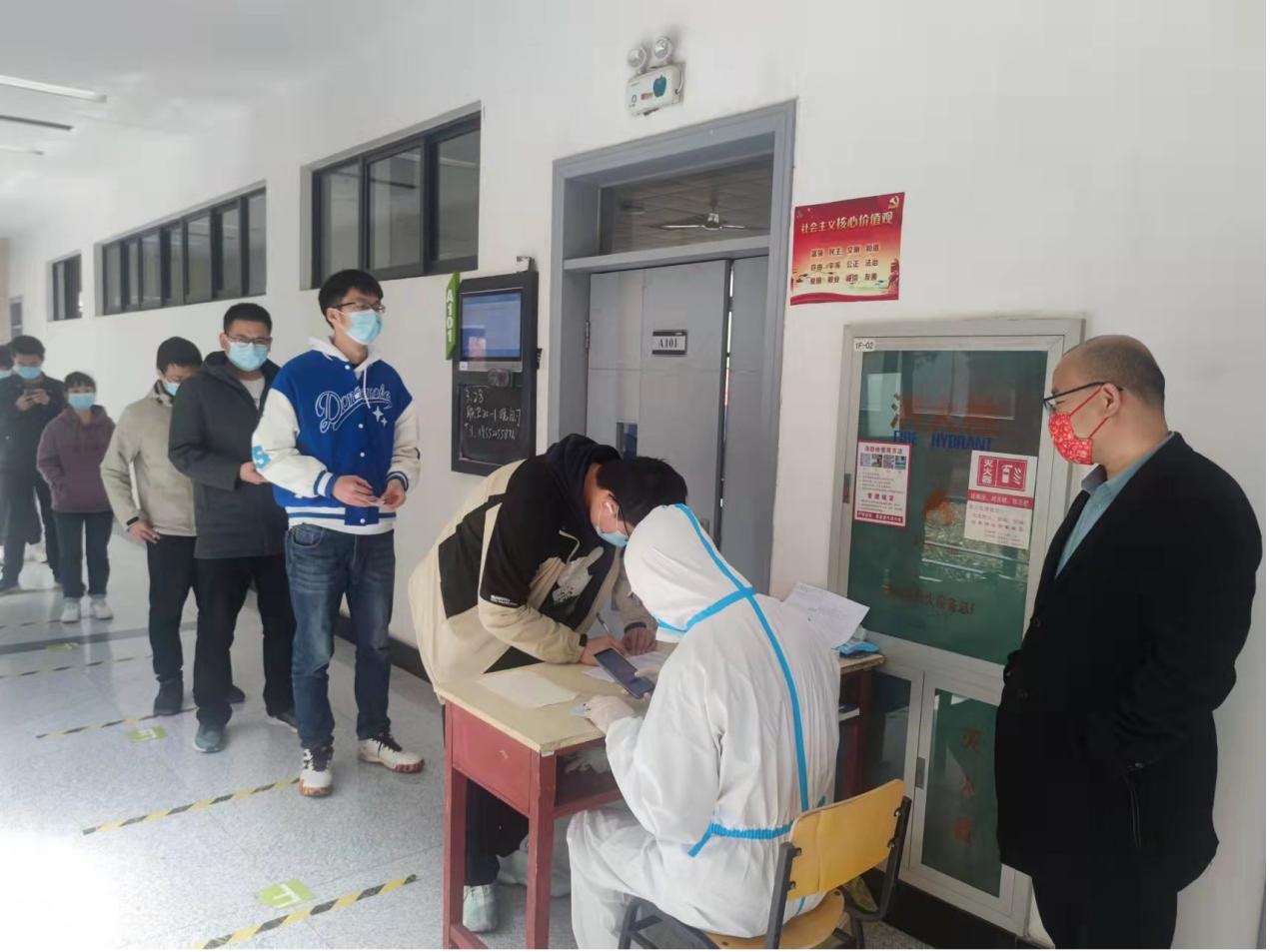 守住一线,全员覆盖。学工队伍冲锋在前,与同学们同吃同住,经常工作至深夜,有许多个凌晨,学工群里还在交流沟通,每一项工作、每一个环节、每一个相关人、每一个时间节点都力求明确具体、指令清晰。专兼职辅导员与学生骨干建立网络化联系,利用学生骨干的榜样带头作用,组织动员每名学生积极参与疫情防控工作。4月3日凌晨1:00左右接到中午前必须完成全员核酸任务,老师们迅速行动,协调团队、调动骨干、准备物资至凌晨3点,早上5点整,老师们和党员骨干就集合在博学三号楼4个集中检测点,王守刚书记、韩福顺副书记现场指导,确保检测顺利进行,至中午11:30,完成全部1985人次核酸检测任务,未出现任何纰漏。除了每日常态化检测工作任务,老师们通过走访宿舍、帮扶约谈、组织班会、线上交流等方式及时帮助同学们解决思想困惑、心理问题和学业问题,做好人文关怀,给予学生温暖的心灵慰藉。