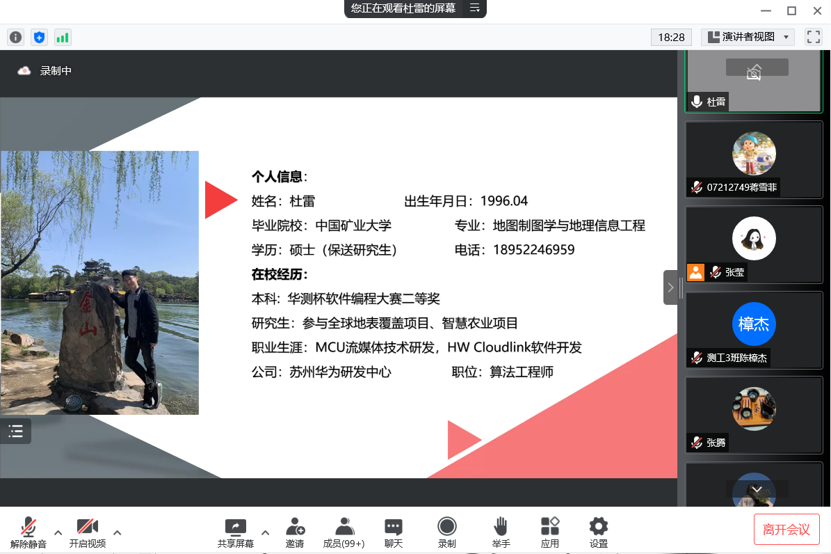 杜雷,中国矿业大学2018届地理信息科学本科毕业,中国矿业大学2021届地图制图学与地理信息工程硕士毕业。本科时期获取华测杯计算机软件编程大赛二等奖,硕士生时期参与全球地表覆盖项目与智慧农业项目,通过深度学习研究病虫害智能检测,并发表一篇目标检测SCI。2019年于华为实习,编写一套图像缩放算子,提高图像缩放性能70%到80%。现工作于华为数字技术(苏州)有限公司,从事视讯领域,职位软件工程师,已通过华为可信专业级认证。