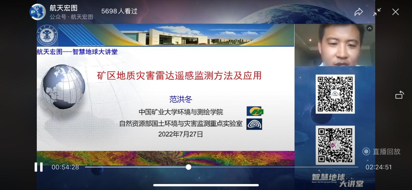 7月27日,应航天宏图信息技术股份有限公司邀请,我院范洪冬老师做客“智慧地球大讲堂”,在线作了题为“矿区地质灾害雷达遥感监测方法及应用”的学术报告。本次报告共吸引了近5700人次观看,受到国内相关领域专家、学者的关注。