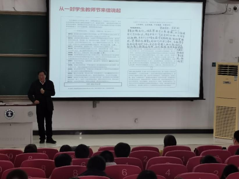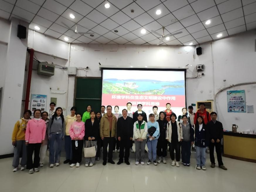 韩宝平教授首先回顾了我校环境学科的发展历程及在全国的地位;从徐州“山水林田湖草”的成功修复与城市生态转型实践,介绍了我校环境学科为区域生态环境质量提升做出的贡献;其次他介绍了我国新时代环境形势、压力和挑战,结合自己的亲身经历,勉励青年教师、在校学生要有大的学科格局,学好环境学科专业知识,练就专业本领;第三,他重点从环境问题的尺度效应、环境系统思维、环境生态理念三个层面系统阐述了环境学科的思维特点。报告最后,他结合国内外当前形势,对新同学提了四点希望,希望同学们做担当民族复兴大任的时代新人,做新时代的追梦人。听讲师生认真记录,现场学术氛围热烈,报告不仅开拓了学术视野,启发了学术思维,也注入了满满的正能量。
