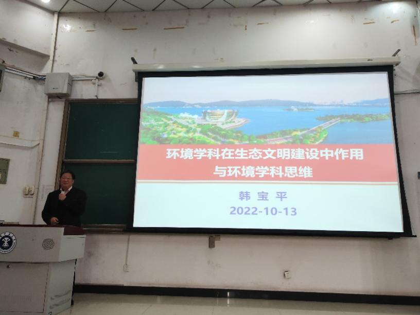 10月13日下午,学院邀请江苏师范大学韩宝平教授来校作了题为“环境学科在生态文明建设中作用与环境学科思维”的学术报告。报告会由我院副院长周来主持,环境学科部分教师、研究生新生、本科生新生等参加了报告会。