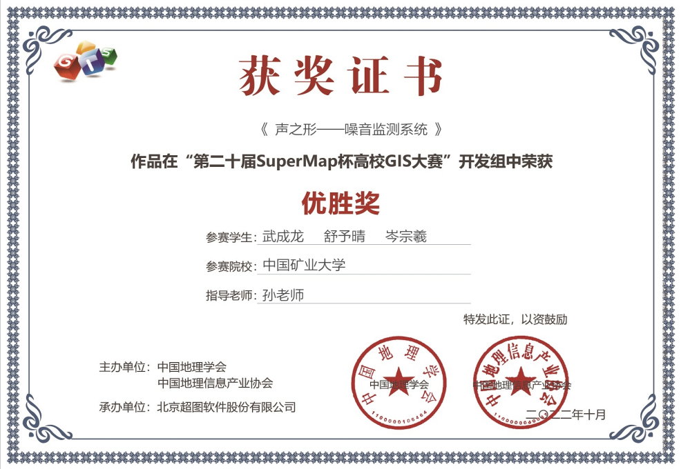 近日,第二十届SuperMap杯高校GIS大赛获奖结果公布,我院学子武成龙、舒予晴、岑宗羲组成的参赛小组在本次大赛中的作品《声之形——噪声监测系统》获得了开发组组参赛类别的优胜奖。