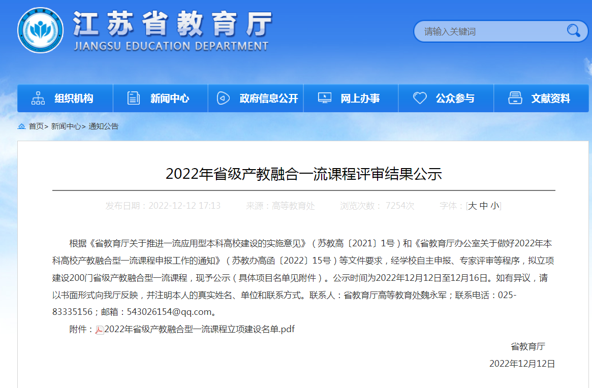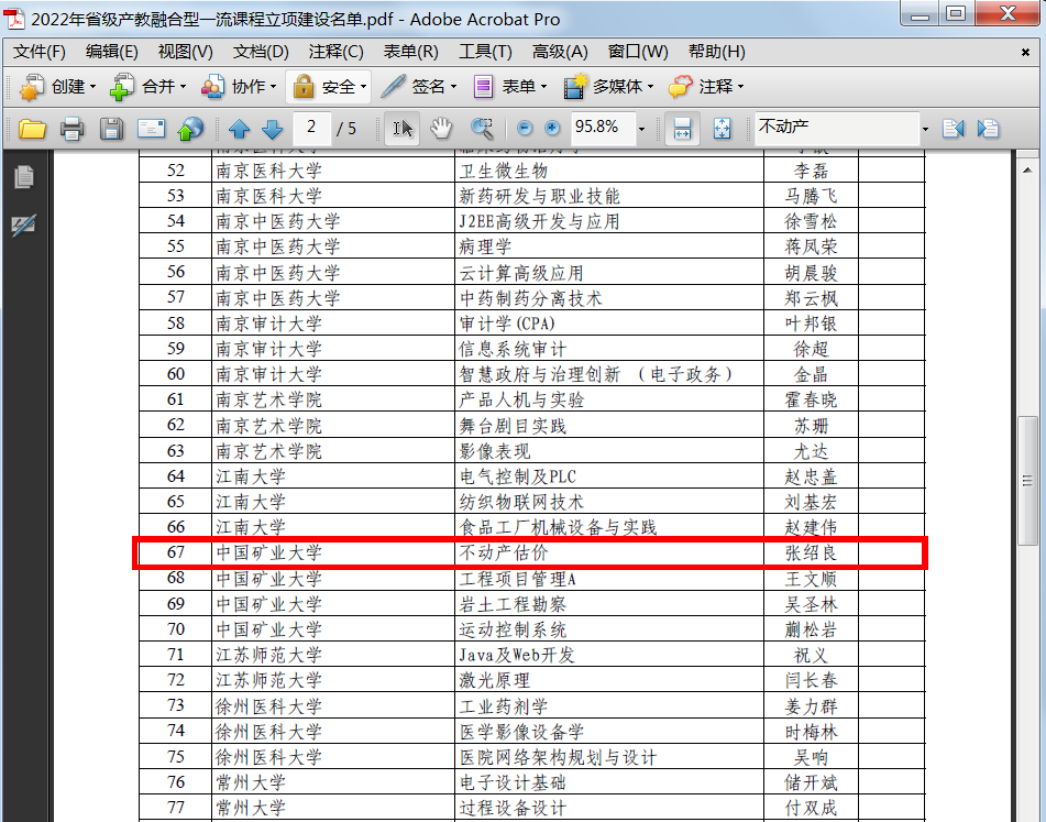 2022年12月12日,江苏省教育厅公布2022年省级产教融合型一流课程评审结果,全省立项200门省级产教融合型一流课程。我院张绍良教授作为课程负责人,侯湖平教授、汪应宏教授、杨永均副教授参与申报的《不动产估价》课程获批立项。