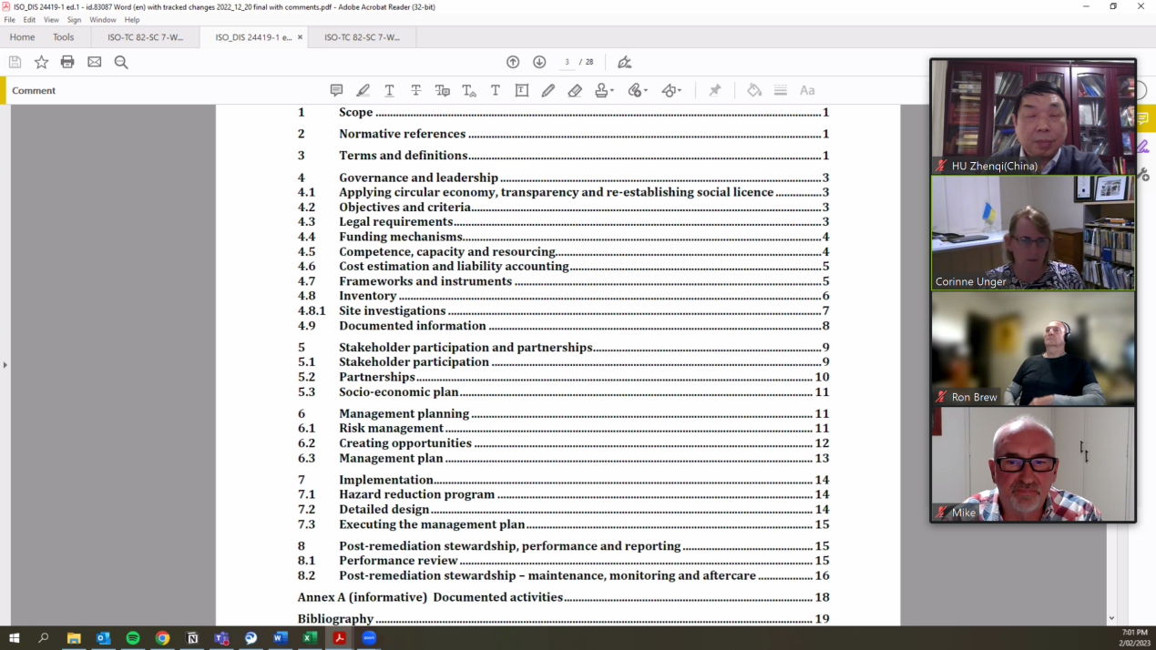 2023年2月2日,国际标准化组织采矿标准化技术委员会矿山关闭与复垦管理分委会第3工作组(ISO/TC82/SC7/WG3)以线上形式组织召开标准专家研讨会,来自中国、法国、加拿大、澳大利亚、德国、韩国等国的14名注册专家参加了会议。会议由牵头起草的澳大利亚专家Corinne Unger主持。我校36365路检测中心胡振琪教授作为注册专家参加了本次研讨会。
