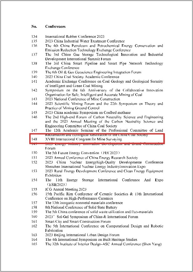 我院承办的第18届国际矿山测量大会入选《指南(2023)》工程与材料科学领域的重要学术会议。本次大会是由中国煤炭学会、国际矿山测量协会联合推荐的国际科技组织机制性会议。