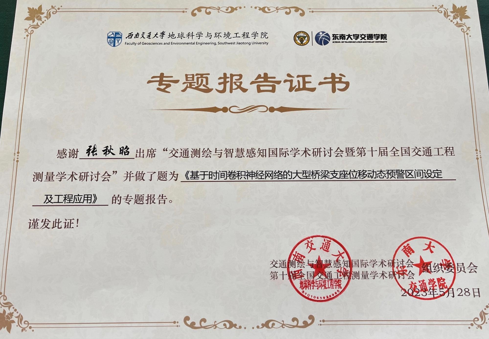“交通测绘与智慧感知国际学术研讨会暨第十届全国交通工程测量学术研讨会”于2023年5月26-28日在四川省成都市隆重召开。会议由中国测绘学会工程测量分会和四川省测绘地理信息学会联合主办,西南交通大学地球科学与环境工程学院、东南大学交通学院承办。会议邀请了长期关注交通工程测量的行业主管部门和信息化交通、交通工程测量、高速铁路与城市轨道交通勘测设计等相关学科领域做出突出贡献的知名专家作大会汇报。我院执行院长郑南山共同担任 “测绘新技术在交通工程中的应用”分会场专题主席。教授张秋昭、硕士研究生吴兆鹏受邀参加本次会议。