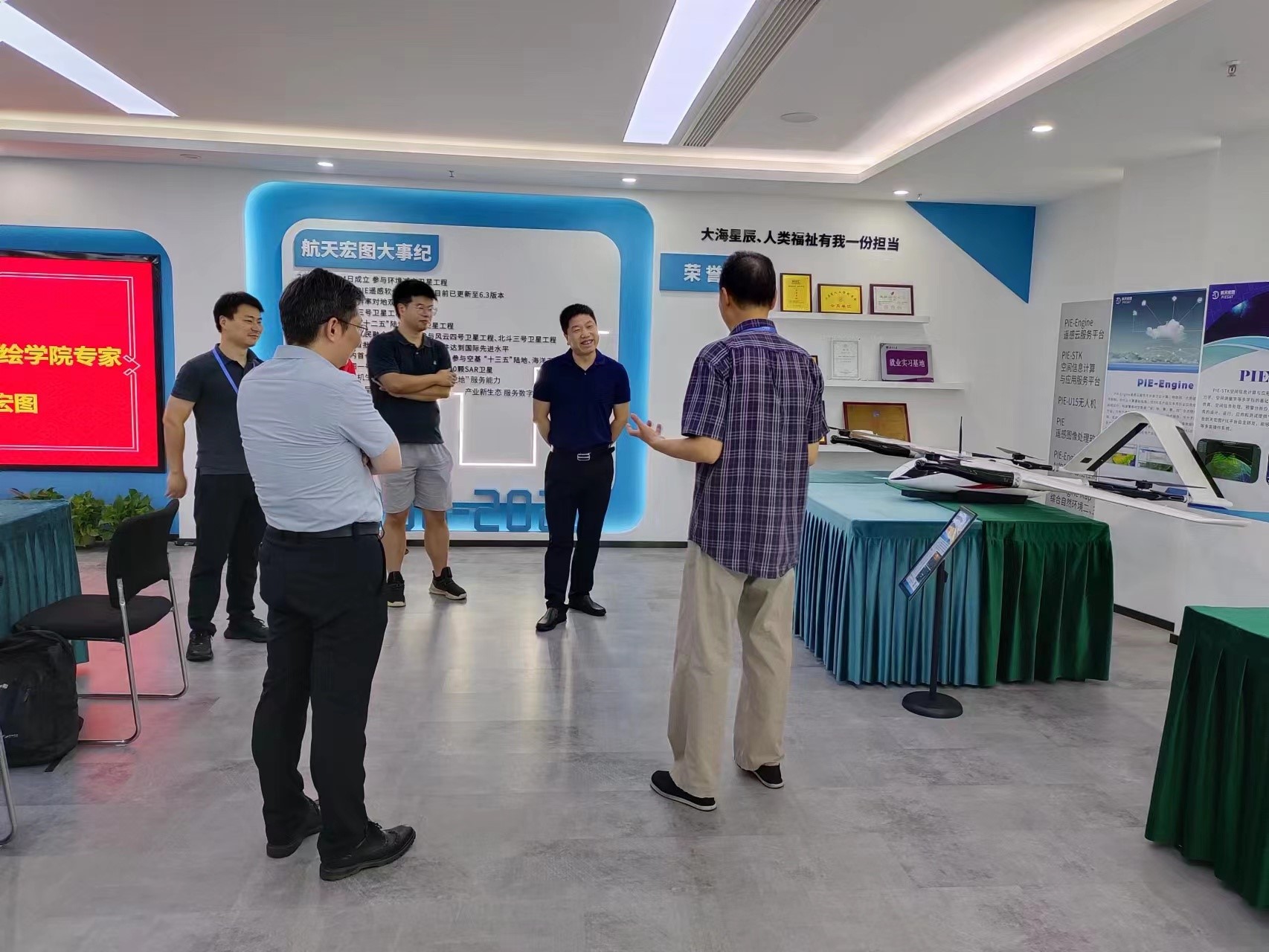 南京航天宏图信息技术有限公司总经理翟建设、副总经理余永安对我院一行人的到访表示欢迎。双方首先参观了航天宏图研发的的固定翼、旋翼无人机设备,回顾了公司方与我校的合作历史,并深入交流了现有测绘遥感领域的新技术发展和应用。