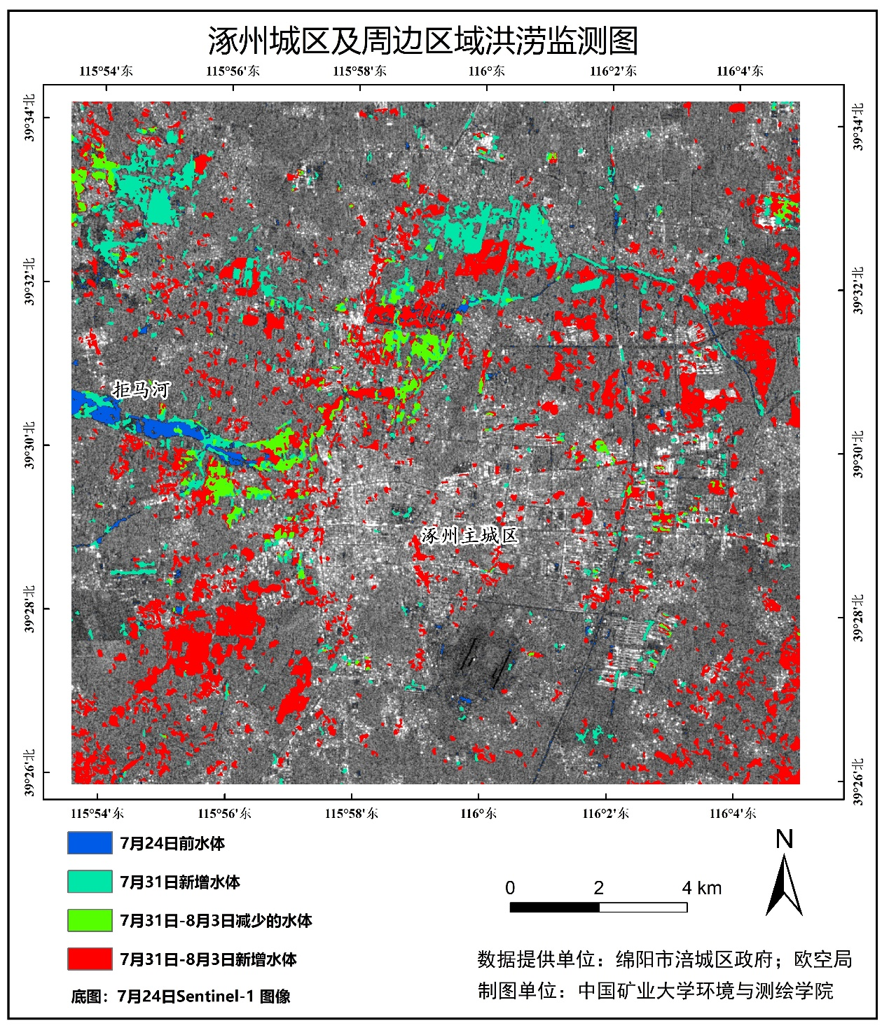 我院师生密切关注本次涿州市洪涝灾情,学院领导决定充分利用专业技术,为灾情提供及时的洪涝灾情监测资讯。副院长王潜心教授带领青年教师庄会富老师、研究生王鹏等人,紧急收集了覆盖涿州市的SAR影像数据(7月24日哨兵1号数据和7月31日、8月3日由“涪城一号”SAR卫星数据),如图1所示。并使用自主研发的数据处理软件对洪水影响进行了分析。结果表明:本轮强降雨以来,涿州市城区及周边地区的洪水情况有了明显变化,如图2所示。7月31日前,涿州市北部及西北部出现了大量的新增水体,而7月31日至8月3日期间,拒马河下游水体有所减少,但城区内部及其周围仍然存在大量水体。该数据揭示了涿州市当地近期持续不断的降雨以及来自上游的洪水,导致本次洪涝灾情十分险峻。当地政府应充分做好洪涝灾害防范工作,公众应加强防范意识,共同应对本次洪涝灾害。