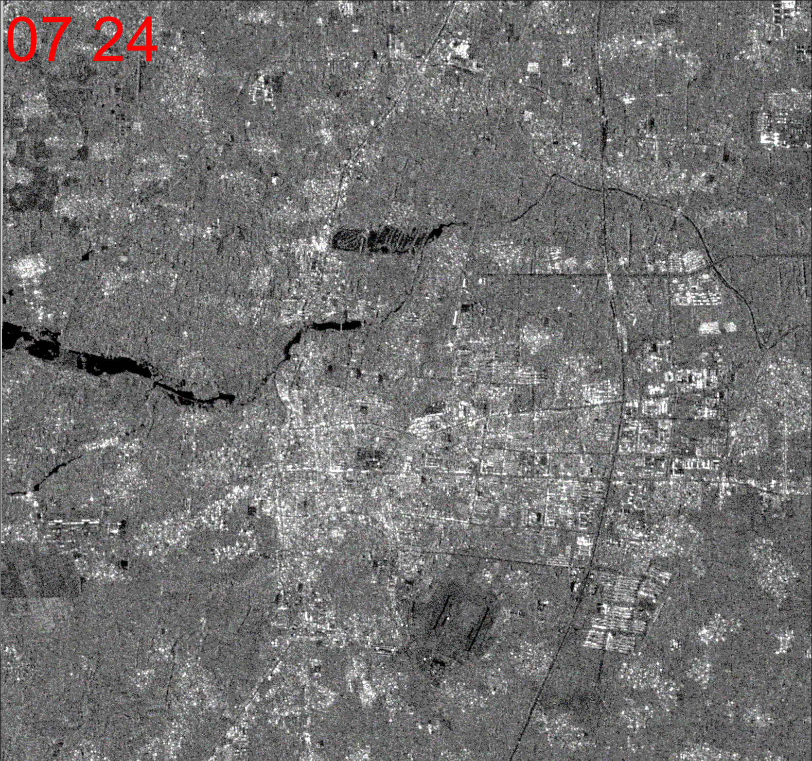 图1 7月24日哨兵1号SAR图像和7月31日、8月3日涪城1号SAR图像动态图