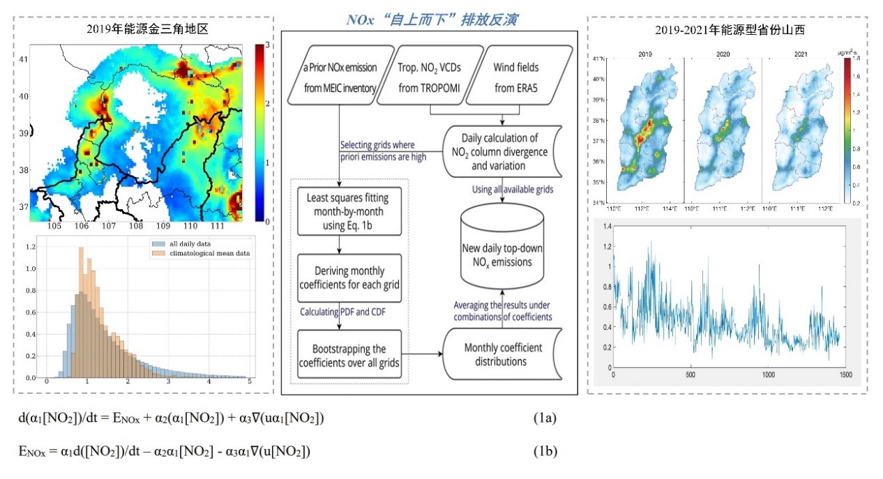 该课题组提出一种基于质量守恒原理和TROPOMI卫星NO2每日柱浓度观测值的高分辨率氮氧化物排放反演方法[MCMFE-NOx],量化得到中国能源金三角地区以及山西省的NOx日排放与不确定度,空间分辨率为0.05° × 0.05°。该方法能够计算获得三个具备物理含义的关键参数:分别为NOx/NO2、NOx寿命以及日水平传输距离。研究表明,第一个参数与大型工业源的燃烧温度和能源效率相关,火电、水泥、钢铁企业的该因子相对高,炼焦、工业锅炉和氧化铝企业相对较低。通过对不确定度进行敏感度分析,证明排放结果的变动空间比相应TROPOMI NO2值的实际变化空间更小且更稳健,这与该研究对第一参数和第二参数方面的物理约束所提供的极端值缓冲有关,进一步支持了该研究方法的可行性。