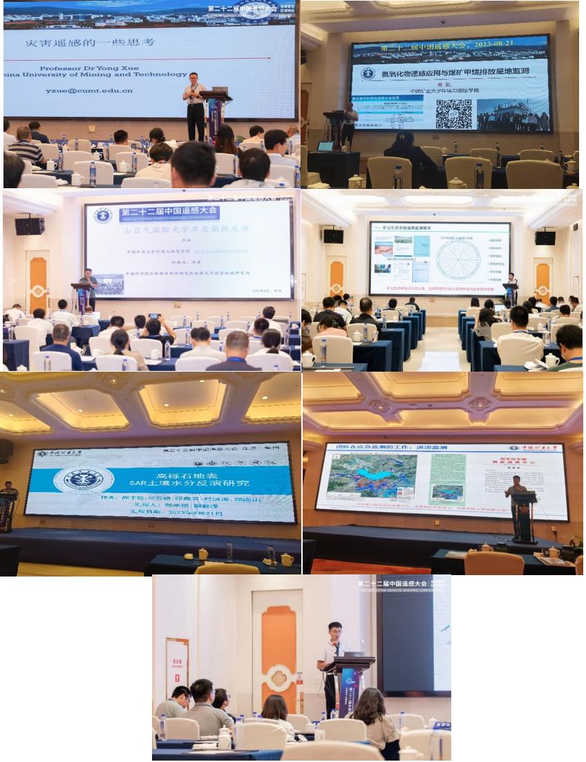 大会学术报告部分,薛勇老师主持了水遥感论坛,并做了题为“灾害遥感的一些思考”的特邀报告。秦凯老师主持了大气遥感论坛,并做了题为“氮氧化物遥感应用与煤矿甲烷排放星地监测”的报告;在矿区遥感与能源环境论坛做了题为“井工煤矿遥感图像检测与大范围露天矿区遥感提取”的报告;受郑南山院长委托在遥感科学与技术学科论坛做了题为“中国矿业大学测绘遥感学科发展”的报告。王涵、郎丰楷、杨永均、赵金奇和时洪涛等老师分别在不同的论坛做了题为“山区气溶胶光学厚度偏振反演”“高砾石地表全极化SAR土壤水分反演方法”“遥感如何深度支持矿山生态修复”“融合“时-空-极化”的改进聚类洪涝检测方法”和“被动微波数据产品约束的时序极化SAR农作物区土壤湿度反演”的报告。