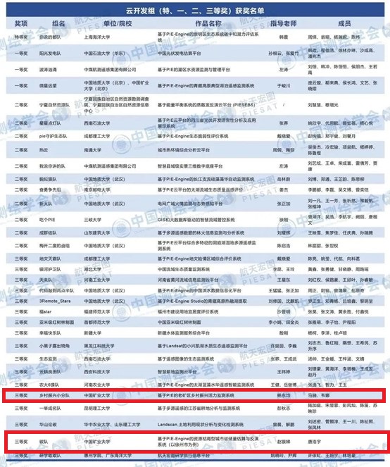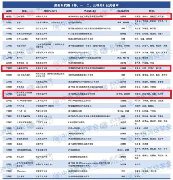 本届大赛吸引了600余支报名队伍以及2000多名参赛选手,经过激烈的角逐,共评选出:桌面开发组特等奖1组,一等奖3组,二等奖10组,三等奖14组;云开发组特等奖1组,一等奖3组,二等奖11组,三等奖17组;遥感应用组特等奖1组,一等奖3组,二等奖12组,三等奖20组;创新组特等奖1组,一等奖4组,二等奖11组,三等奖14组;优胜奖若干;优秀指导老师奖22组;优秀组织奖33组。