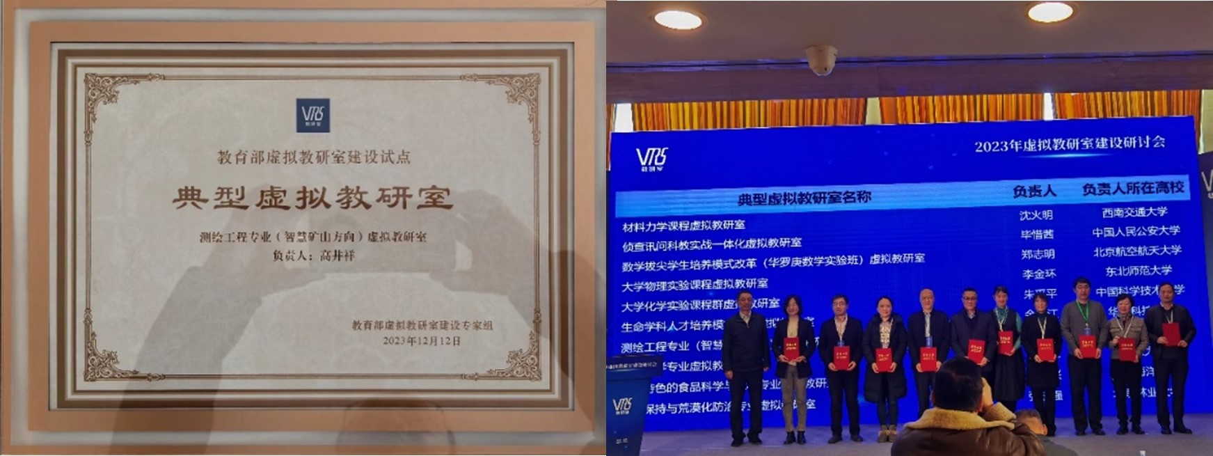 2023年12月23日,虚拟教研室建设研讨会在武汉召开,虚拟教研室建设专家组发布了《关于发布虚拟教研室试点建设典型名单的通知》,我院高井祥教授作为负责人的教育部测绘工程专业(智慧矿山方向)虚拟教研室入选典型虚拟教研室并在会上获得表彰。