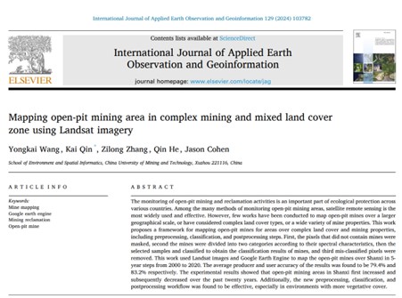 Yongkai Wang, Kai Qin, Zilong Zhang, Qin He, Jason Cohen. (2024). Mapping open-pit mining area in complex mining and mixed land cover zone using Landsat imagery, International Journal of Applied Earth Observation and Geoinformation, 129,103782.