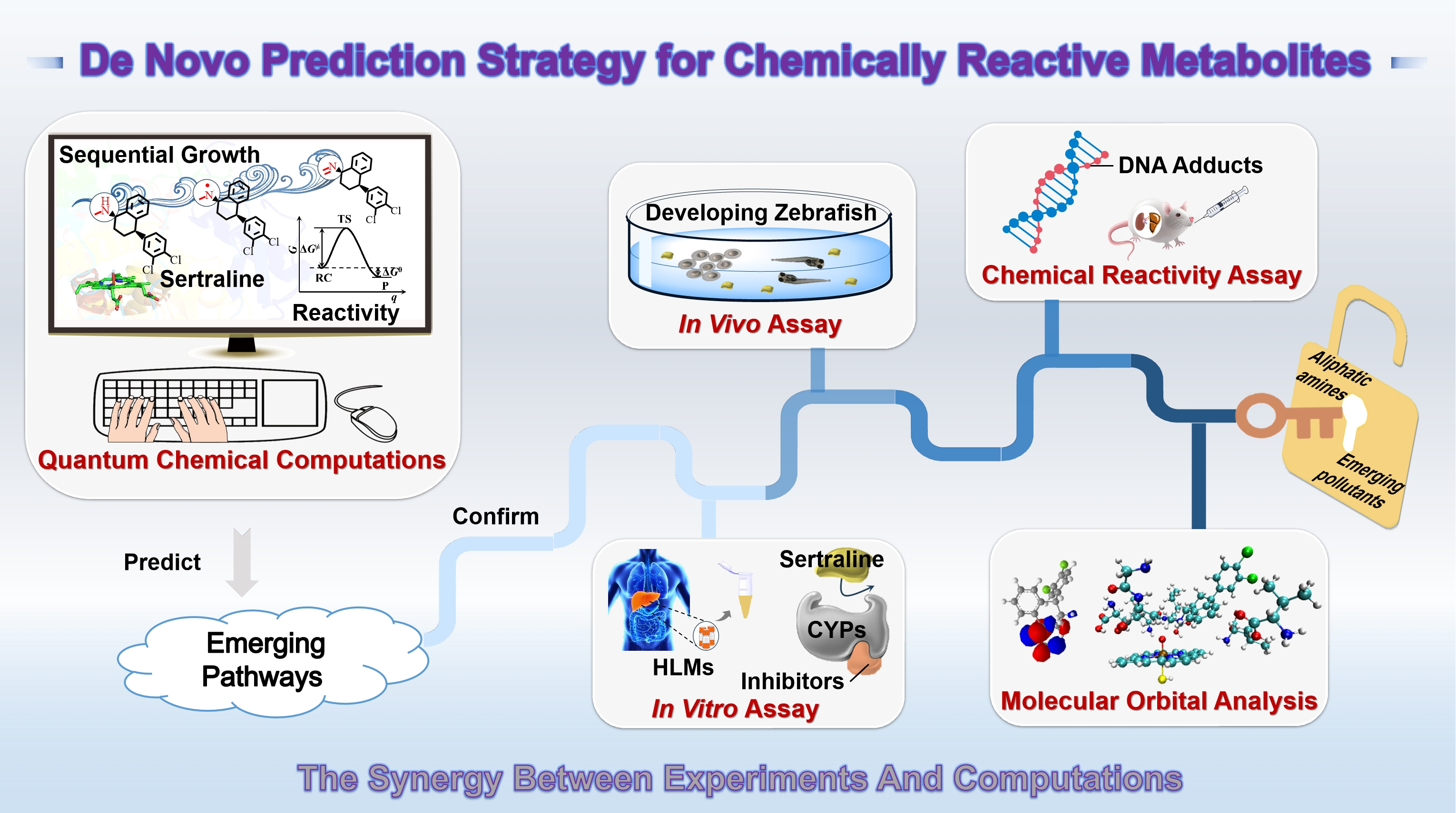 舍曲林是医学上一种广泛使用的抗抑郁药,在生产过程的外泄和生物体的不完全代谢排泄导致其在环境中积累,并在环境水样中常被检测出,成为当前一种颇受关注的新污染物,但目前对舍曲林的环境健康影响的研究较为缺乏。我院青年教师程诗洋博士等采用计算和实验多步骤协同的从头预测策略,对舍曲林的氨基官能团进行反应性顺序演进的量子化学计算预测,通过高分辨质谱方法在人肝微粒体孵育和斑马鱼胚胎暴露实验中确认了可疑致突变代谢产物舍曲林恶嗪啶的存在,并在小鼠体内试验中检测得到舍曲林恶嗪啶与DNA的加合产物。并基于Bell-Evans-Polanyi原理,揭示了脱饱和路径广泛存在于以舍曲林为模式底物的脂肪胺类微污染物中,如农药阿特拉津和轮胎抗氧化剂6PPD等。该工作发展的从头预测方法有望为科学评估新污染物在全生命周期过程中的环境健康风险提供支撑。相关研究成果形成题为“Insight into chemically reactive metabolites of aliphatic amine pollutants: A de novo prediction strategy and case study of sertraline”的学术论文近期在线发表于环境健康领域顶级学术期刊《Environmental Internatinal》(中国科学院一区Top期刊,IF=11.8)。
