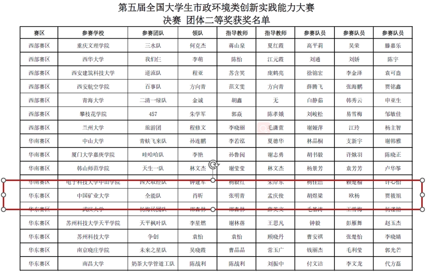 近日,第五届全国大学生市政环境类创新实践能力大赛决赛圆满结束。我院环境科学专业学生胡煜梁、欧杨、贾筱旭组成的中国矿业大学参赛队表现优异,获得团体二等奖。