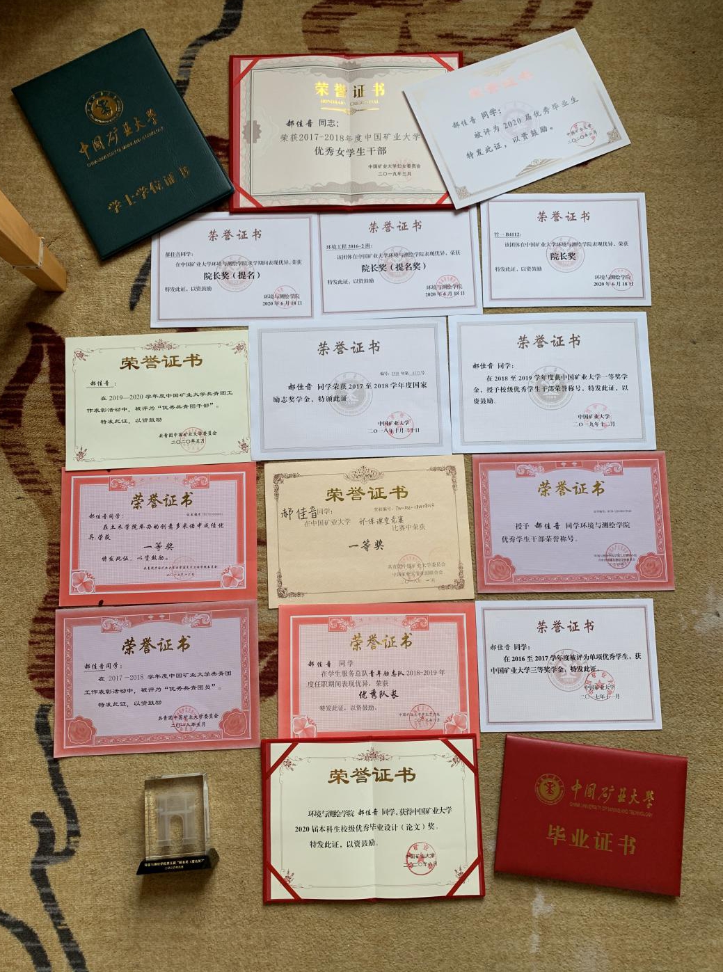 在学习之余,郝佳音也积极参加创新类的科研活动,完成一项省级大学生创新创业项目和一项校级大学生创新创业项目;获得首届城市水环境与水生态科普创意大赛“科普文章类优秀奖”;第三届徐州市节能高校邀请赛的优秀奖;“挑战杯”校内选拔赛三等奖;两项实用新型专利……同时积极参加学校举办的文体类活动,在迎“新时代中国特色社会主义”主题知识竞赛中获得三等奖;在“纪念12.9运动主题演讲朗诵比赛”中获得三等奖;在2017“创职杯——创业就业知识竞赛”中获得三等奖;在中国矿业大学第一届志愿生涯规划大赛中获得三等奖……