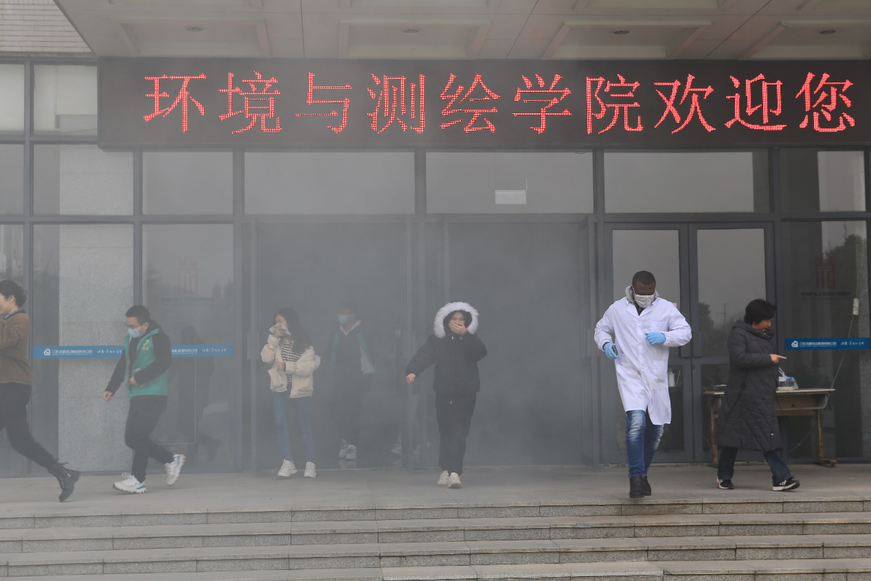 我院环测楼共有10个研究生工作室,人员密度较大,学生未经过应急疏散逃生演练,缺乏基本逃生技能。此次演习分别在研究生工作室集中分布的A区四层、B区三层、四层释放烟雾、鸣警报。参加演习的人员听到警报后,用湿毛巾捂住口鼻,按照疏散指示低姿前行,就近从楼梯有序撤离楼宇。撤离后,师生们在一楼大厅前集合,郑南山院长对学院消防安全工作作了明确指示和要求,郭东副院长对本次演练活动作了点评。届时我院2021年学生安全教育和培训工作圆满完成。